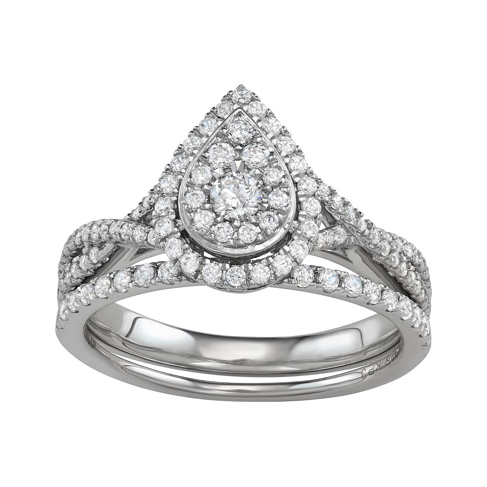 Beautifully decorated with dazzling round-cut diamonds, this 14k white gold teardrop engagement ring set is a breathtaking symbol of your commitment.