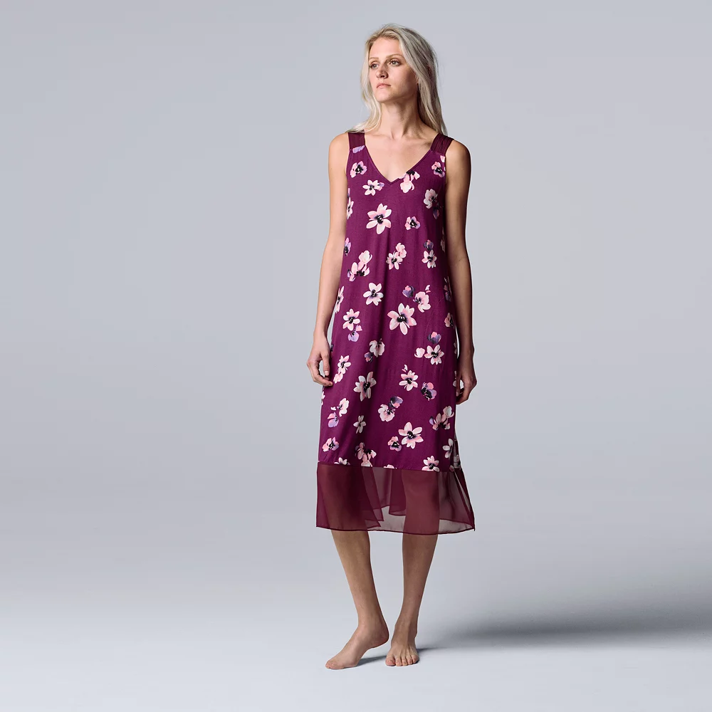Featuring a luxuriously soft jersey construction with satin and chiffon accents, this women’s Simply Vera Vera Wang chemise abounds with feminine style and comfort.